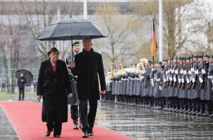 «Наш премьер элегантно начал пресс-конференцию с канцлером Германии Меркель, оба говорили на немецком языке и оба пошутили о джентельменском поведении Кариньша, когда тот держал зонтик над канцлером во время торжественного парада», - написала парламентский секретарь премьер-министра Эвика Силиня.