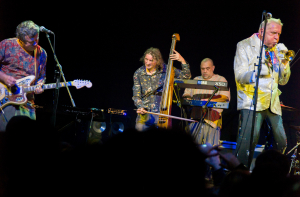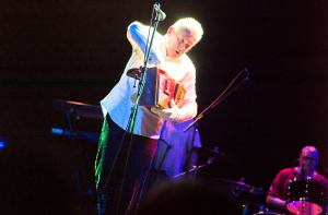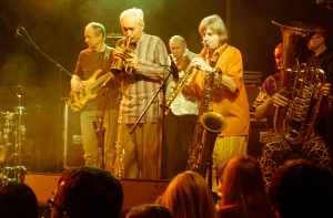 Редкий автор, пишущий об «АукцЫоне», упускает возможность сказать, что это группа, которую важно слушать живьем. После Таллина это снова кажется неизбежным – совсем небольшая сцена Rock Cafe с появлением девяти человек мгновенно расширилась до масштабов целой филармонии. Посмотришь в ее левую часть – там Федоров и Волков, переглядываясь, соревнуются в импровизации. Посмотришь правее – из-за рожков выглядывает трехголовая духовая секция, напоминающая волшебных героев «Армянмультфима». На заднем плане Дмитрий Озерский отбивает аккорды на клавишах и проговаривает тексты песен, которые сам же написал. А по центру – неутомимый аукцыоновский скоморох Гаркуша, скачет с портфелем под мышкой, как и 20 лет назад.