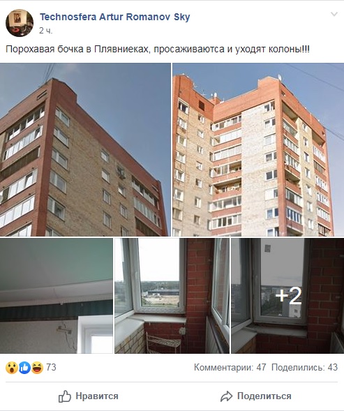 В социальной сети Facebook в группе “Плявниеки” появилось сообщение о трещинах в одном их многоэтажных домов. Пользователь пишет, что этот дом стал “пороховой бочкой”.