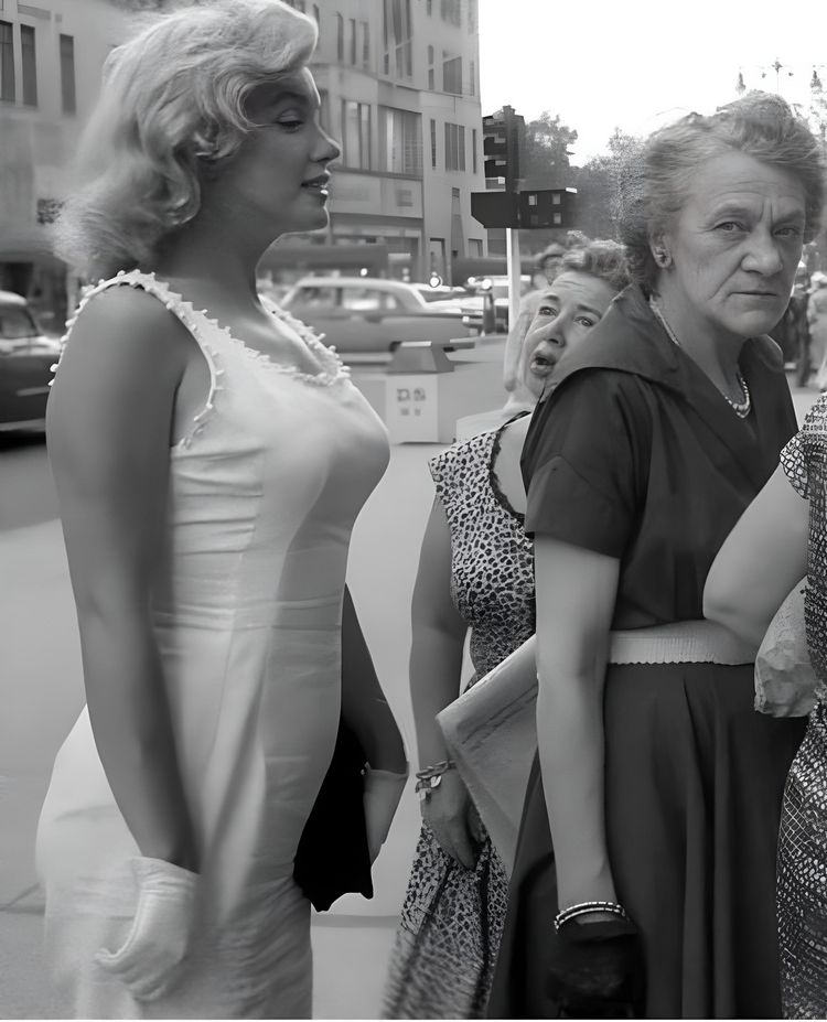 Она – икона, но здесь просто стоит, как все, с хот-догом в руке и лёгкой улыбкой, что таит грусть. Улица бурлит, а Монро – в ней, такая уязвимая, напоминание: даже богини жуют на ходу и мечтают о нормальности.