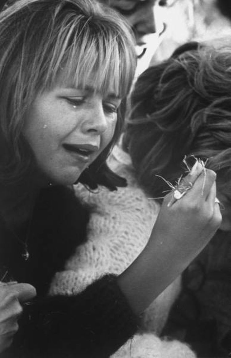 Слёзы в глазах, пучок травы в руках – реликвия идола. Битломания в чистом виде: любовь, что граничит с безумием, и снимок ловит ту дрожь, когда кумир оставляет след не только в сердце, но и в земле.