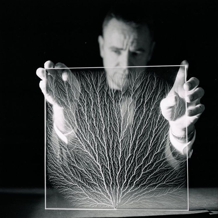 Учёный с блоком в руках, где молния заперта, как дикий зверь в клетке. Взгляд его – смесь страха и восторга, а воздух, наверное, искрится от адреналина. Это момент, когда человек дерзнул схватить небо за хвост, и фото ловит ту искру гения.