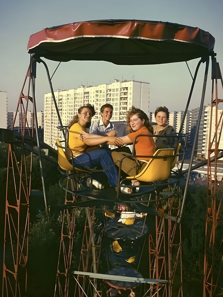 Представьте: ветер в волосах, смех эхом по кабинкам, а внизу – серый, но такой родной советский пейзаж. Эти ребята ловят миг свободы, пока мир вертится вокруг, и кажется, что вся жизнь впереди – беззаботная, как этот полёт.