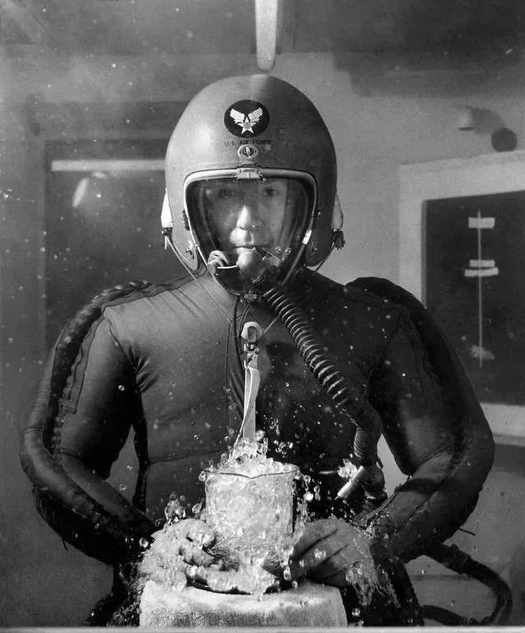 Человек в специальном костюме в барокамере испытывает давление на высоте 19 км – вода кипит при температуре тела. 8 февраля 1953 года: героизм науки, где каждый вдох – подвиг.