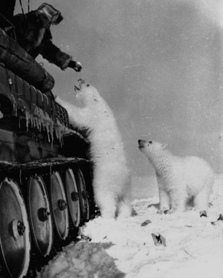 В разгар суровых учений на Чукотке советский солдат делится с белыми медведями лакомством – сгущенным молоком. 1950 год, СССР, и в этом жесте проступает такая человечность, что морозы кажутся теплее.