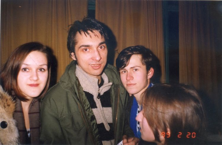 Основатель «Короля и Шута» Михаил Горшенёв после концерта в «Юбилейном» позирует с фанатами, сияя той самой рок-н-ролльной искрой. Санкт-Петербург, 20 февраля 1999 года – момент чистой энергии и близости.