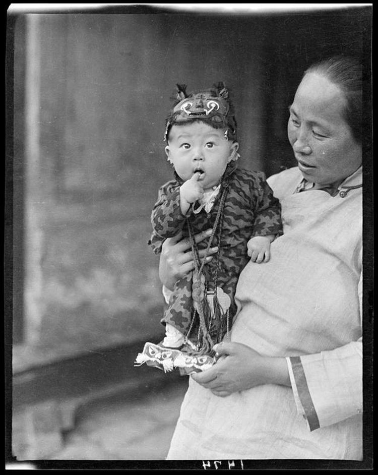 Малыш в пушистом тигрином костюме резвится в Пекине между 1918 и 1919 годами. Китай тех лет оживает в этой детской шалости, полной невинной радости.