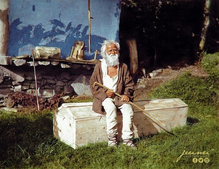 Румынский крестьянин из Вранчи спокойно сидит на гробу, который выстругал сам для себя. 1937 год, фото раскрашено в теплые тона жизни, и оно шепчет о принятии неизбежного с тихим достоинством.
