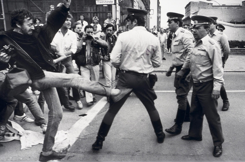 Фотограф из Западного Берлина во время демонстрации даёт пинка полицейскому, который находится по другую сторону границы в Восточном Берлине, 13 августа 1986 года