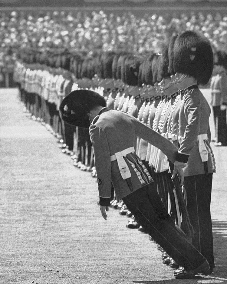 1957 год: солдат английской королевской гвардии падает в обморок от жары, но никто не двигается, чтобы не нарушить правила. Этот снимок - о дисциплине и человеческой уязвимости, что вызывает смешанные чувства жалости и восхищения.