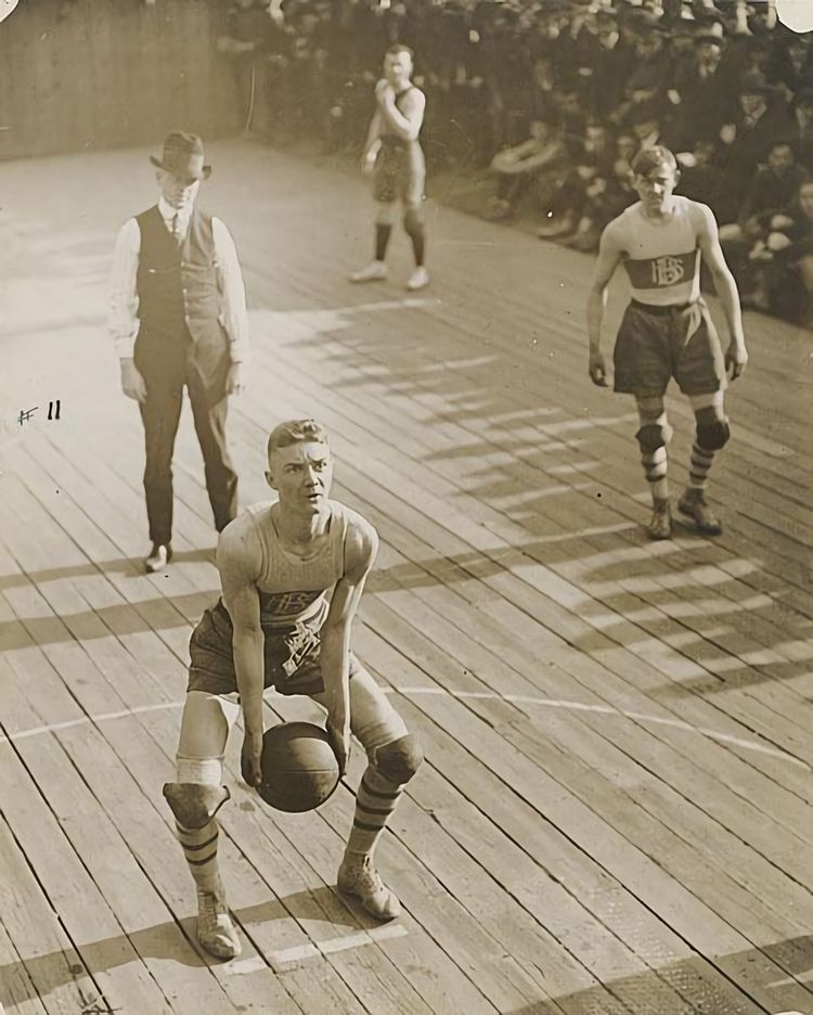 1921 год, баскетболист из школы для мальчиков забивает штрафной бросок - и да, школьники тогда выглядели совсем по-другому, с той серьёзностью, что добавляет снимку нотку забавной ностальгии.
