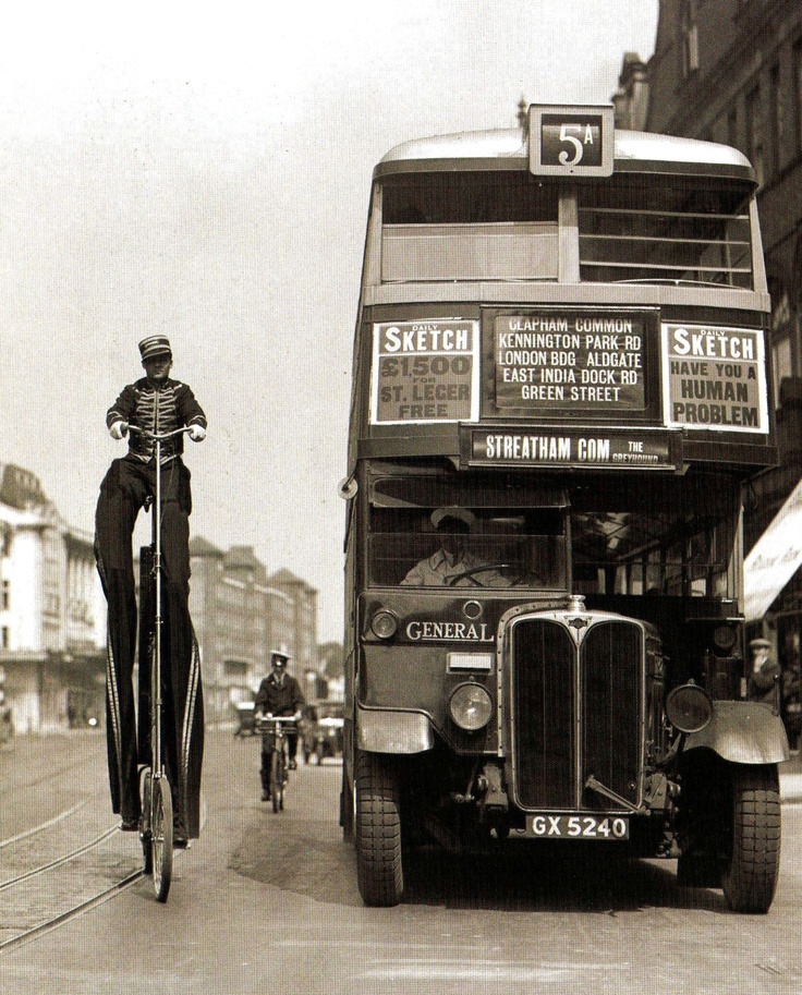 Немецкий циркач Карл Сэндер во время велопрогулки по Лондону, 1932 год.