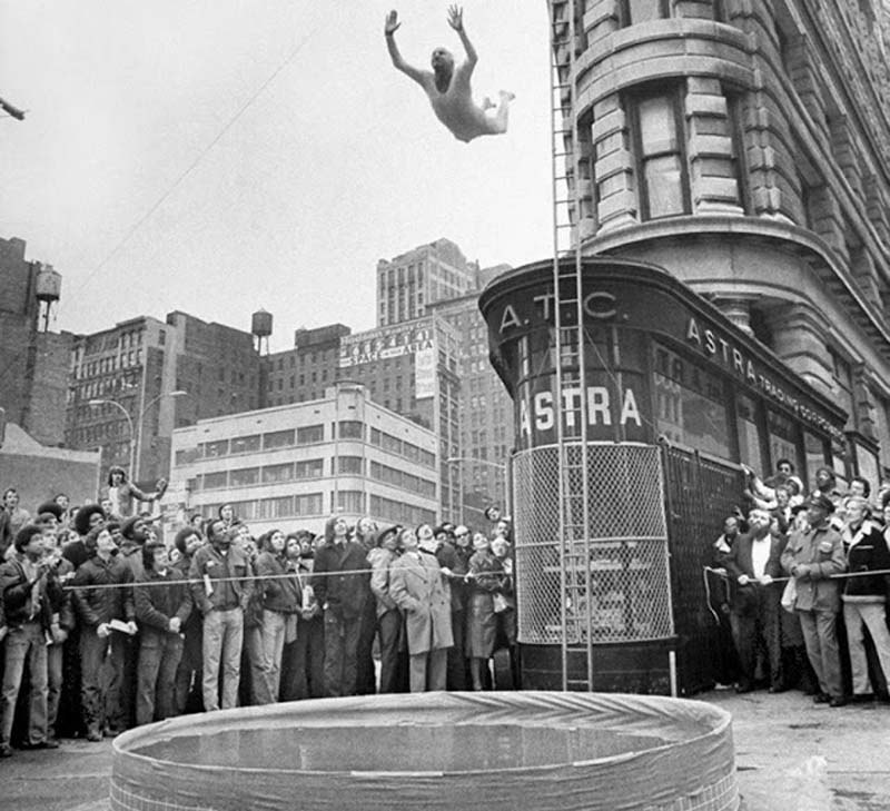 Генри Ламотт отмечает своё 70-летие прыжком с пятнадцати метров в бочку с водой, 1974 год.