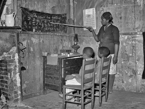 Мать обучает детей цифрам и буквам на дому, Трансильвания, штат Луизиана, США, 1939 год.