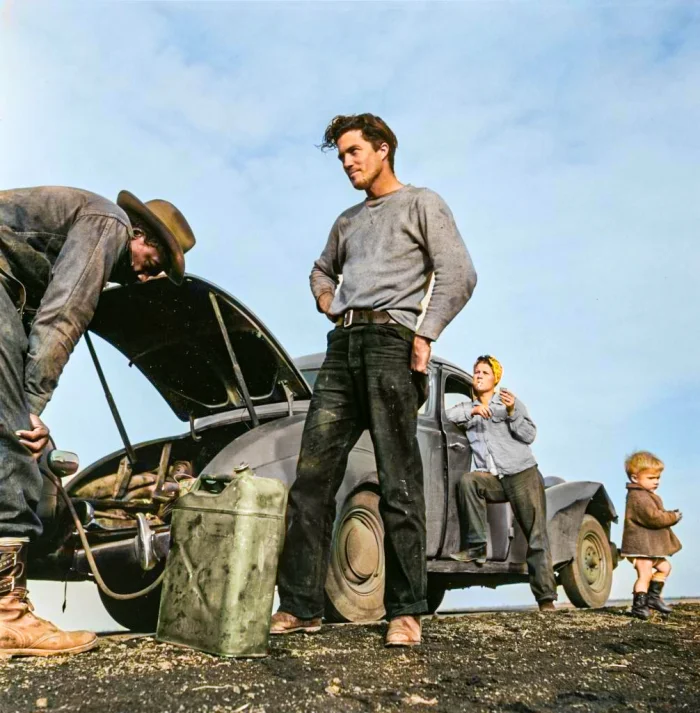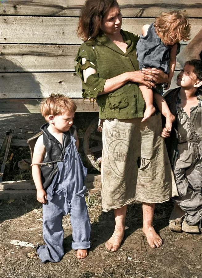 Семья с детьми, живущая в скромном доме у реки, - это портрет эпохи Великой депрессии. Простота и стойкость в каждом взгляде.