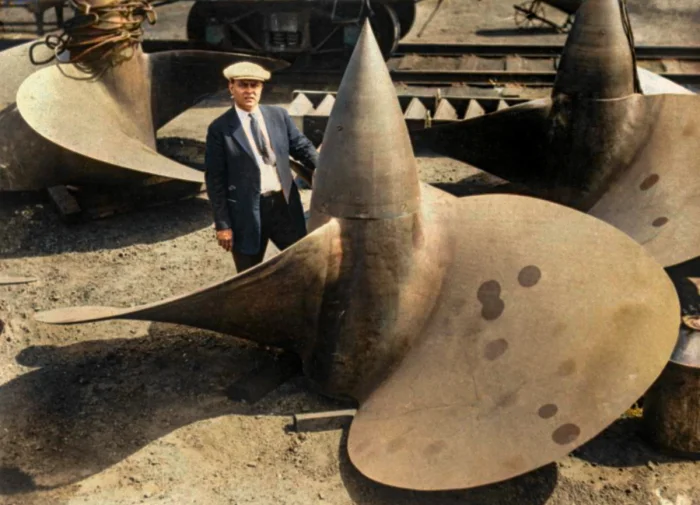 Мужчина осматривает огромные винты с корабля «Левиафан» - деталь, которая напоминает о мощи и амбициях американского судостроения.