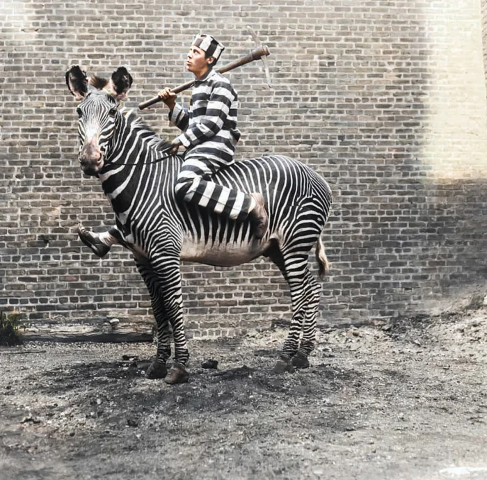 Комический снимок: «преступник» убегает на чучеле зебры! Этот кадр, созданный для Университета Небраски, добавляет в коллекцию нотку абсурдного юмора.