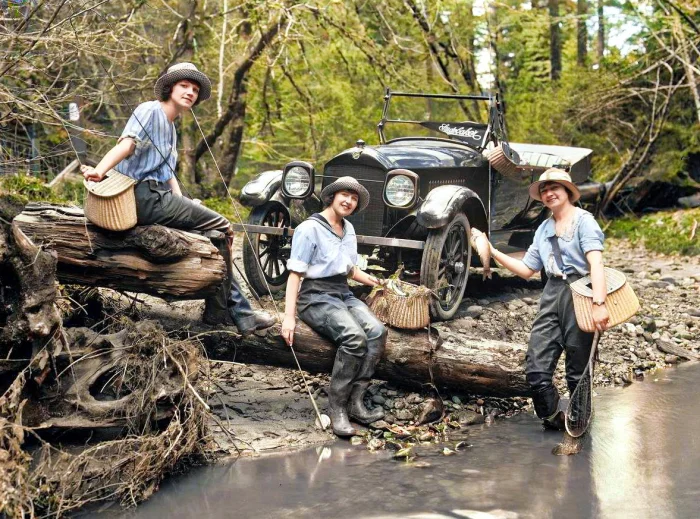 Девушки с удочками у автомобиля Studebaker Big Six - это не рыбалка, а яркий рекламный ход. Снимок Джон Спивака - пример того, как маркетинг начала XX века использовал женскую энергию.