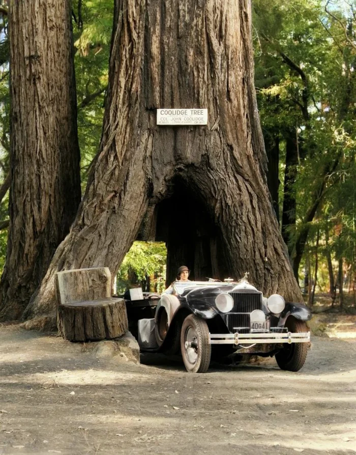 Женщина проходит через вырезанный в стволе гигантской секвойи тоннель - символ американской предприимчивости и любви к зрелищам. Такие деревья стали туристической сенсацией ещё в XIX веке.