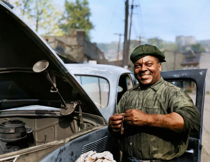 Сэм, автомеханик с уверенным взглядом, - воплощение трудолюбия и мастерства. Этот снимок 1941 года - дань уважения рабочим рукам Америки.