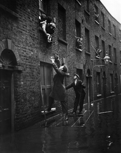 Мужчина спасает ребенка из затопленного здания в Лондоне во время наводнения, 1928 год.