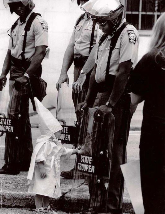 Ребенок в одежде Ку Клукс Клана встречает добровольцев охраны правопорядка штата Джорджия, 1992 год.