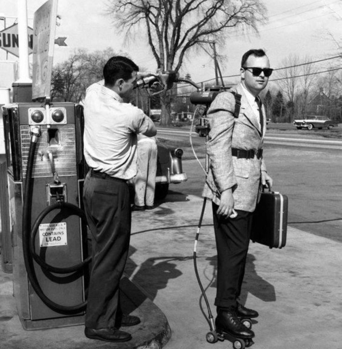 Продавец заправляет свои моторизованные роликовые коньки на заправочной станции, 1961 год.