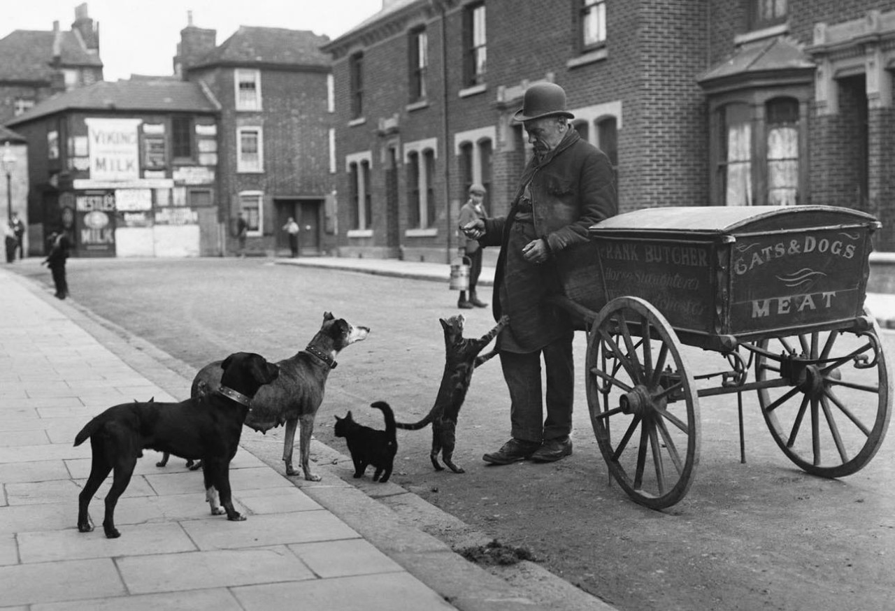 Уличный мясник, также называемый «кошачьим мясником», готовится покормить кошек и собак, выстроившихся перед ним в очередь, Лондон, около 1900 года.