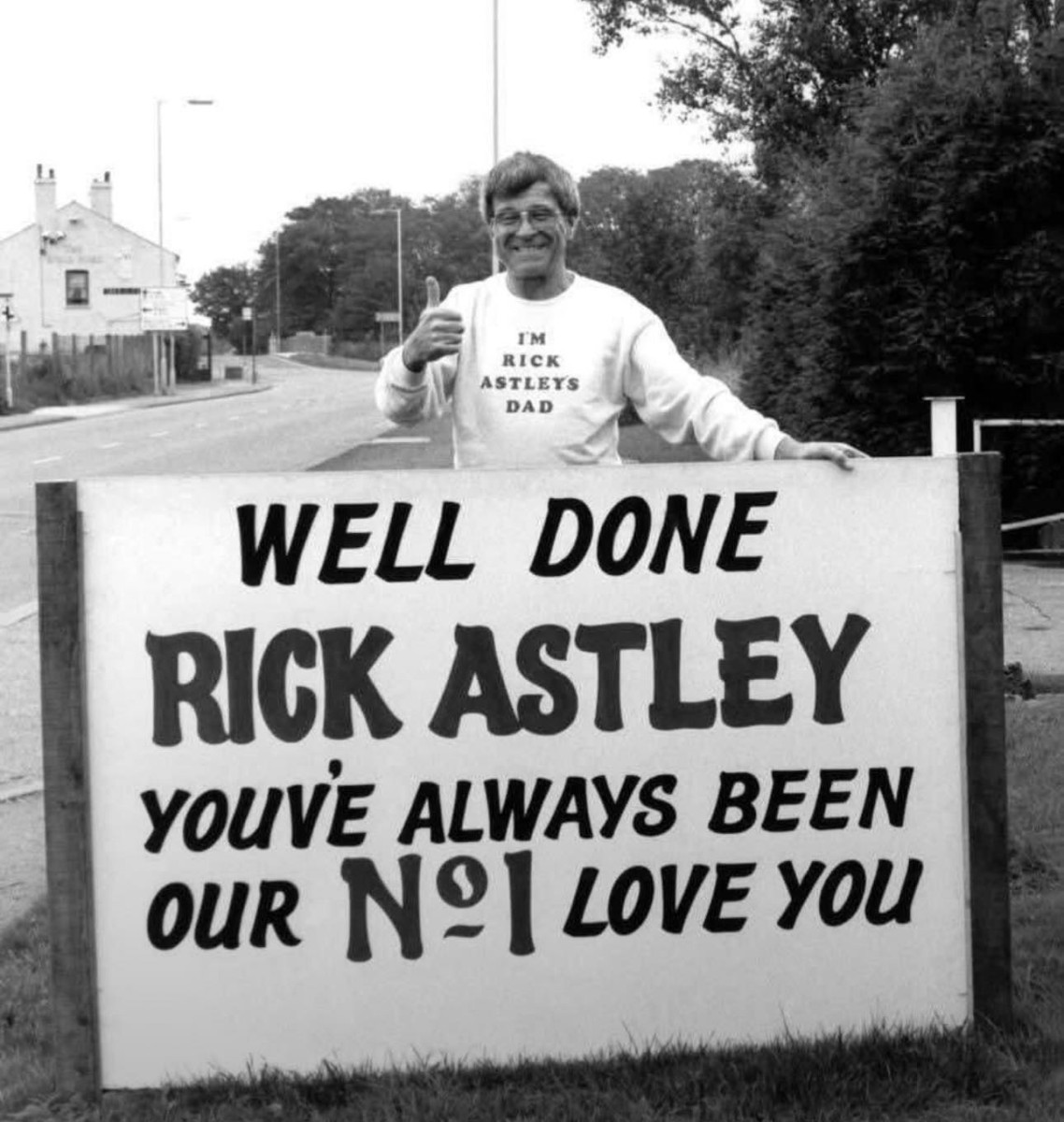 Осси Эстли, отец Рика Эстли, празднует выход песни «Never Gonna Give You Up» на первое место в британских чартах в 1987 году.