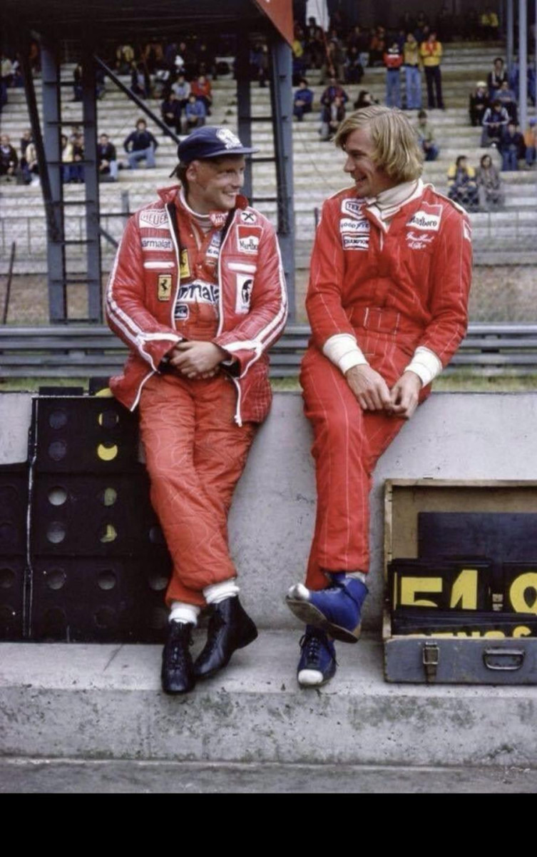 Легенды Формулы-1 Ники Лауда и Джеймс Хант смеются у стены бокса, 1970-е годы.