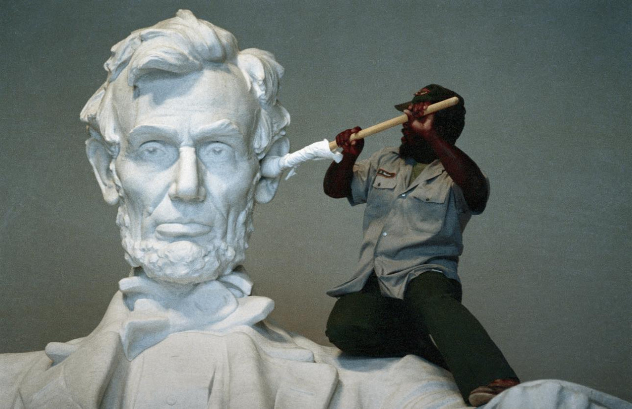 Сотрудник Национальных парков Джеймс Хадсон использует обернутую тканью палку, чтобы очистить ухо Линкольна в Мемориале Линкольна в 1987 году.