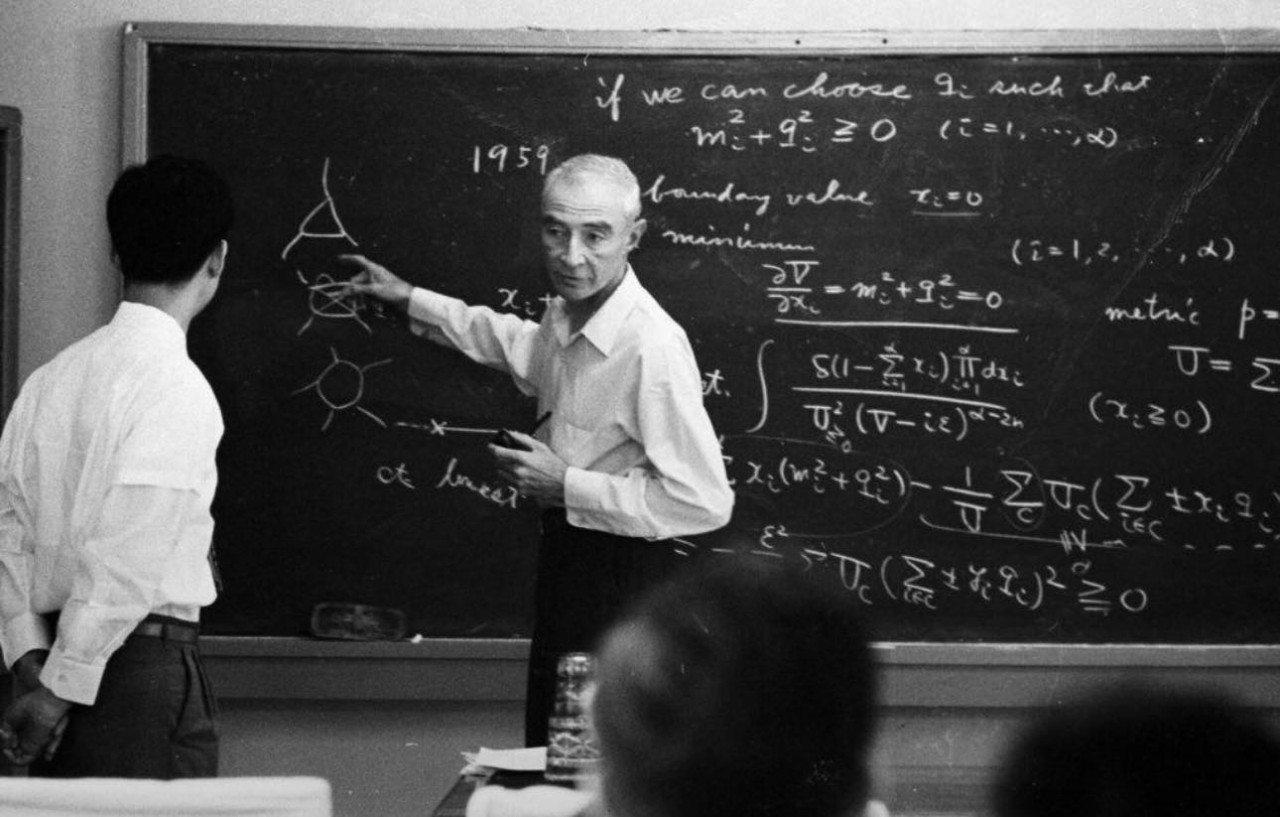 Дж. Роберт Оппенгеймер читает лекцию в Киотском университете 14 сентября 1960 года в Киото, Япония.