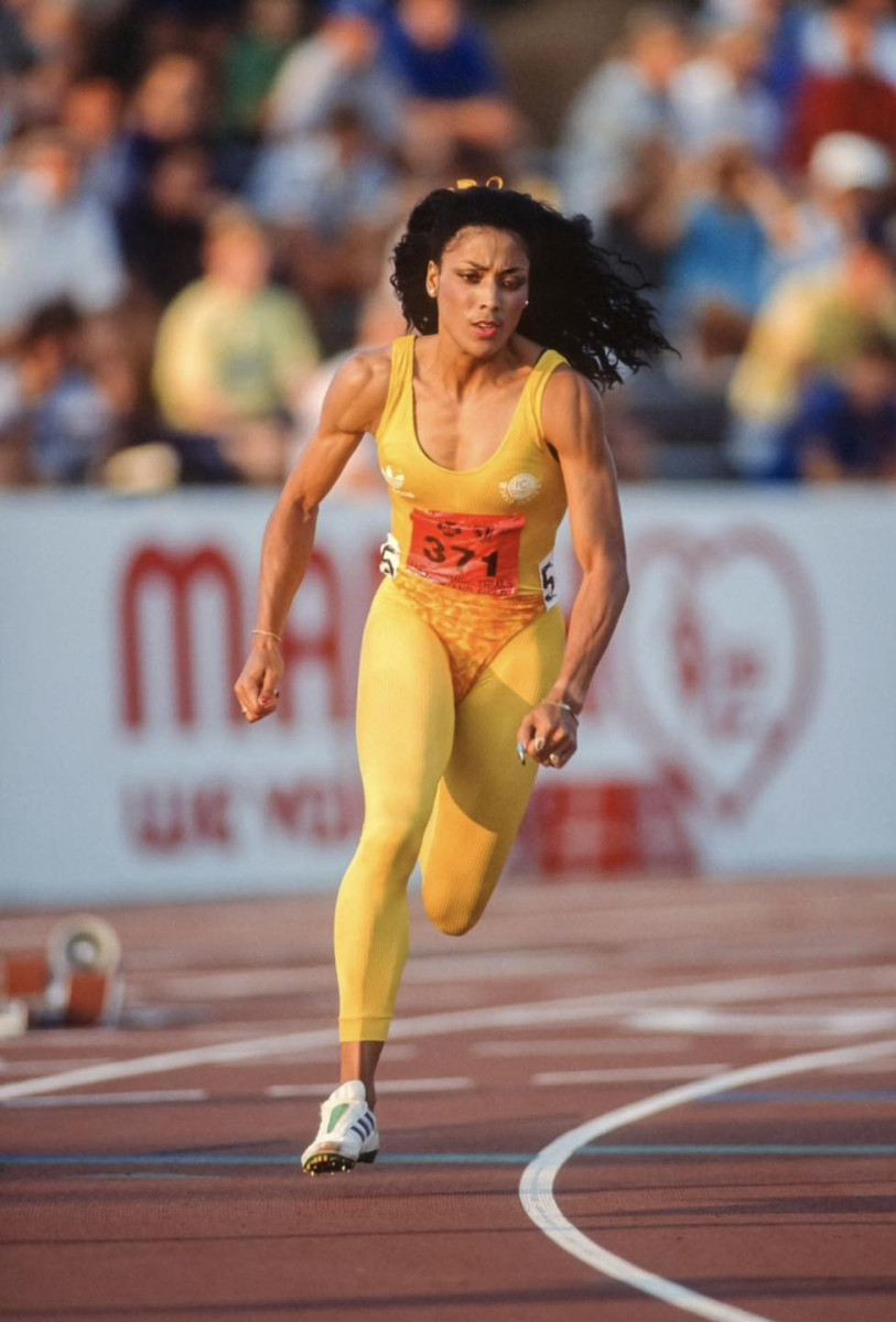 Олимпийская легкоатлетка Флоренс «ФлоДжо» Гриффит-Джойнер на отборочных соревнованиях в Индианаполисе перед Олимпийскими играми 1988 года в Сеуле.