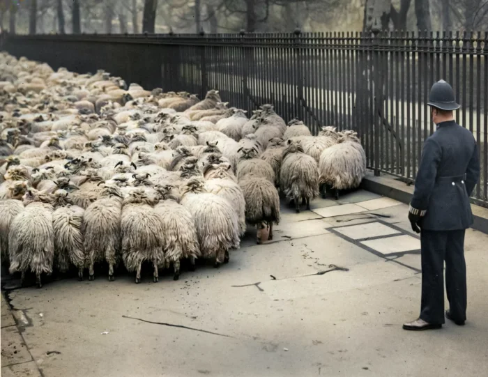 Полицейский и овцы, полицейский сопровождает стадо из Гайд-парка в Грин-парк. Лондон, 1930-е.