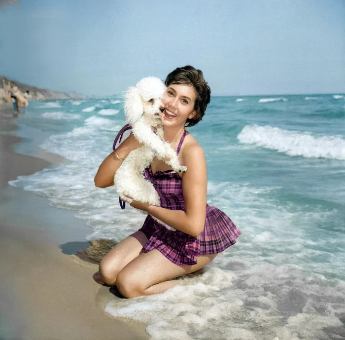 Анита Харрис на пляже, актриса Анита Харрис с пуделем Даки. Борнмут, 1959. Фотограф: Альберт Купер.