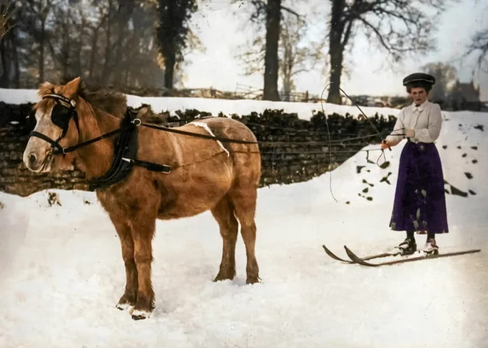 2. Лошадь ведёт женщину, Нортгемптон. Женщина шагает за лошадью по пыльной дороге. Нортгемптон, 1908. В те времена лошадь была не просто транспортом - она диктовала ритм дня. Этот кадр - почти поэма о тихом партнёрстве человека и животного.