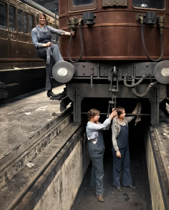 Копоть, щётки, тяжёлый труд - и никаких жалоб. Когда мужчины ушли на фронт, женщины взяли молотки, сварочные аппараты и даже паровозы. Этот кадр - начало большой истории о том, как война открыла двери, которые потом пытались закрыть.