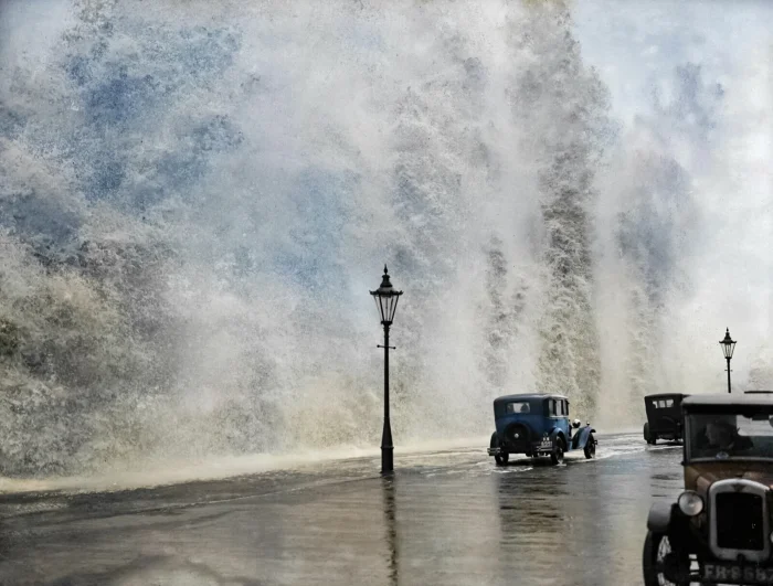 Шторм в Скарборо, волны бьют по набережной Скарборо. Йоркшир, 1931.