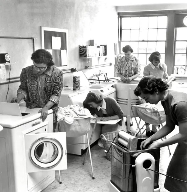 Студентки домоводства изучают особенности коммерческих стиральных машин, стирая бельё семей преподавателей. Итака, штат Нью-Йорк, Корнеллский университет, 1951 год. Фото Нины Лин.