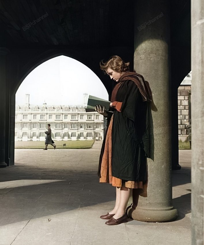 Студентка Кембриджского университета стоит перед аркой и читает. Англия, Великобритания, 1957 год.