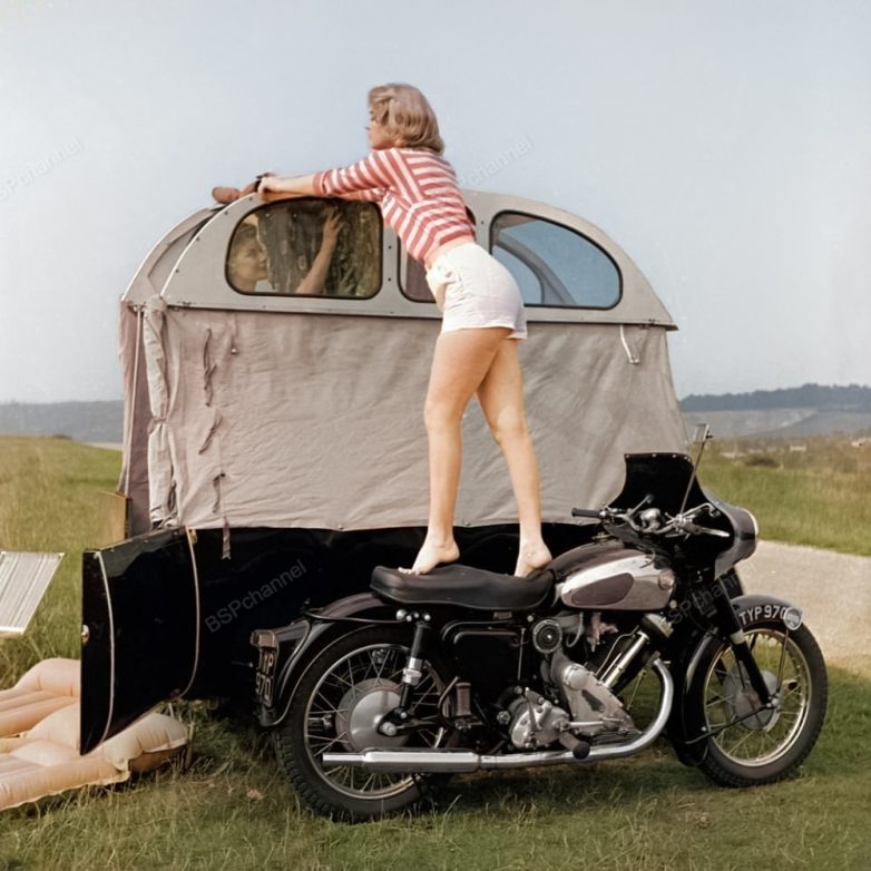 Девушки демонстрируют, как превратить мотоцикл с коляской в небольшой дом на колёсах. Мотоцикл - Panther модель 120. Англия, 1958 год.