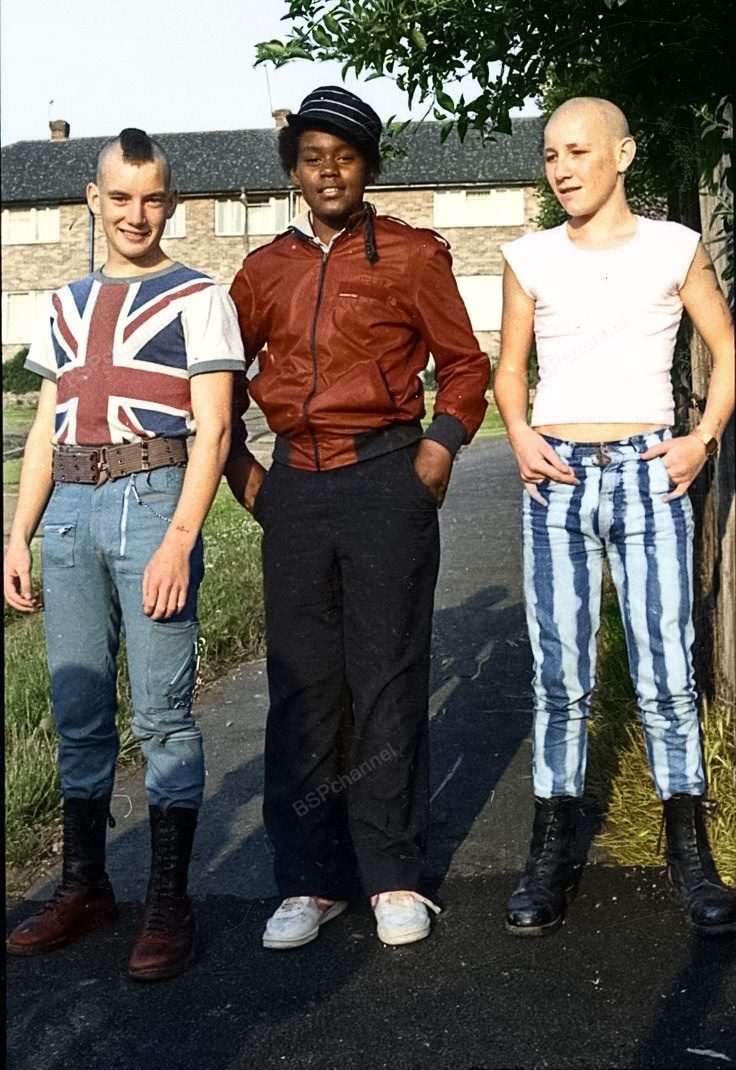 Панк, руд-бой и скинхед тусуются вместе в Англии, 1980 год.