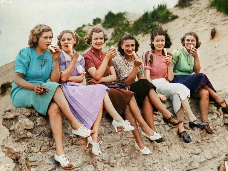 Женщины едят мороженое на пляже. Великобритания, 1938 год.