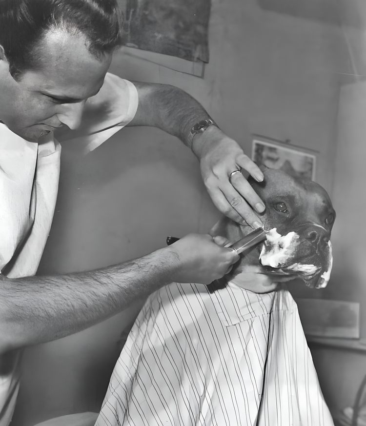 Калифорнийский парикмахер бреет Фрица, известного на телевидении боксёра, 1961 год
