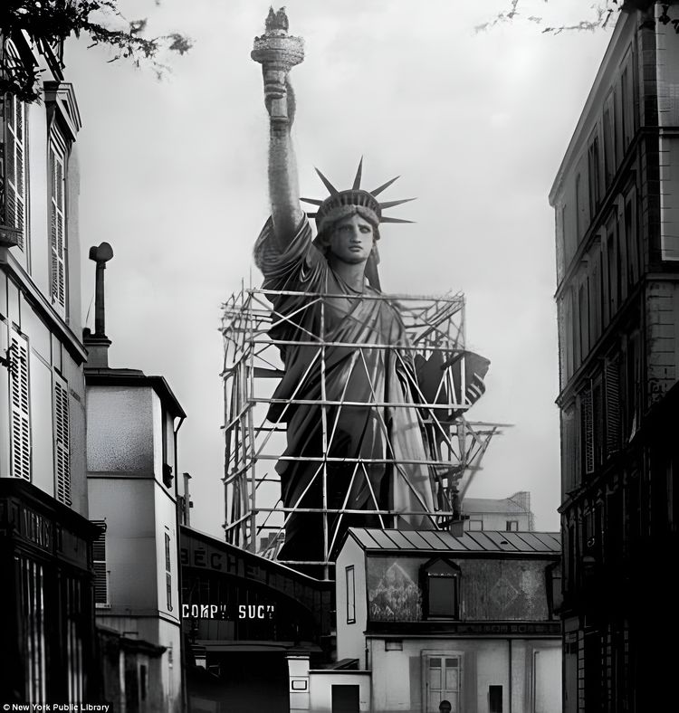 Статуя Свободы в окружении строительных лесов во время завершения её строительства в Париже, около 1885 года