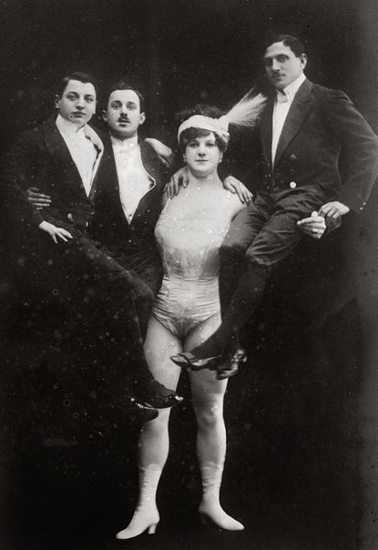Цирковая силачка Кэти Сандвина, «Леди Геркулес» держит трёх мужчин в воздухе, ок. 1910 г.