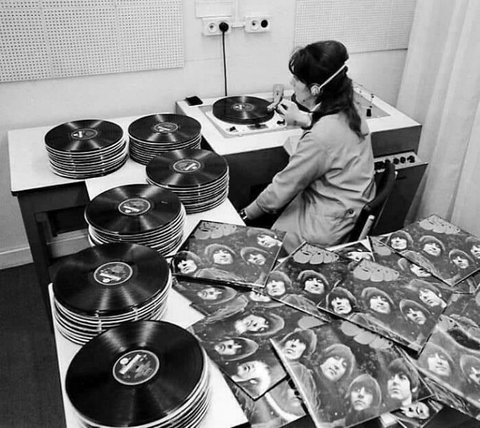 Контроль качества на заводе по производству виниловых пластинок в Лондоне, 1965 год. Истинное мастерство - на слух определить брак.