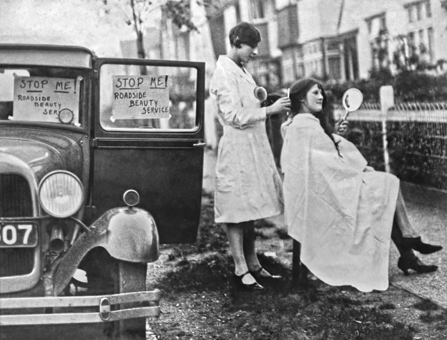 Владелица передвижного салона красоты обслуживает клиентку в Лондоне. Около 1930 года.