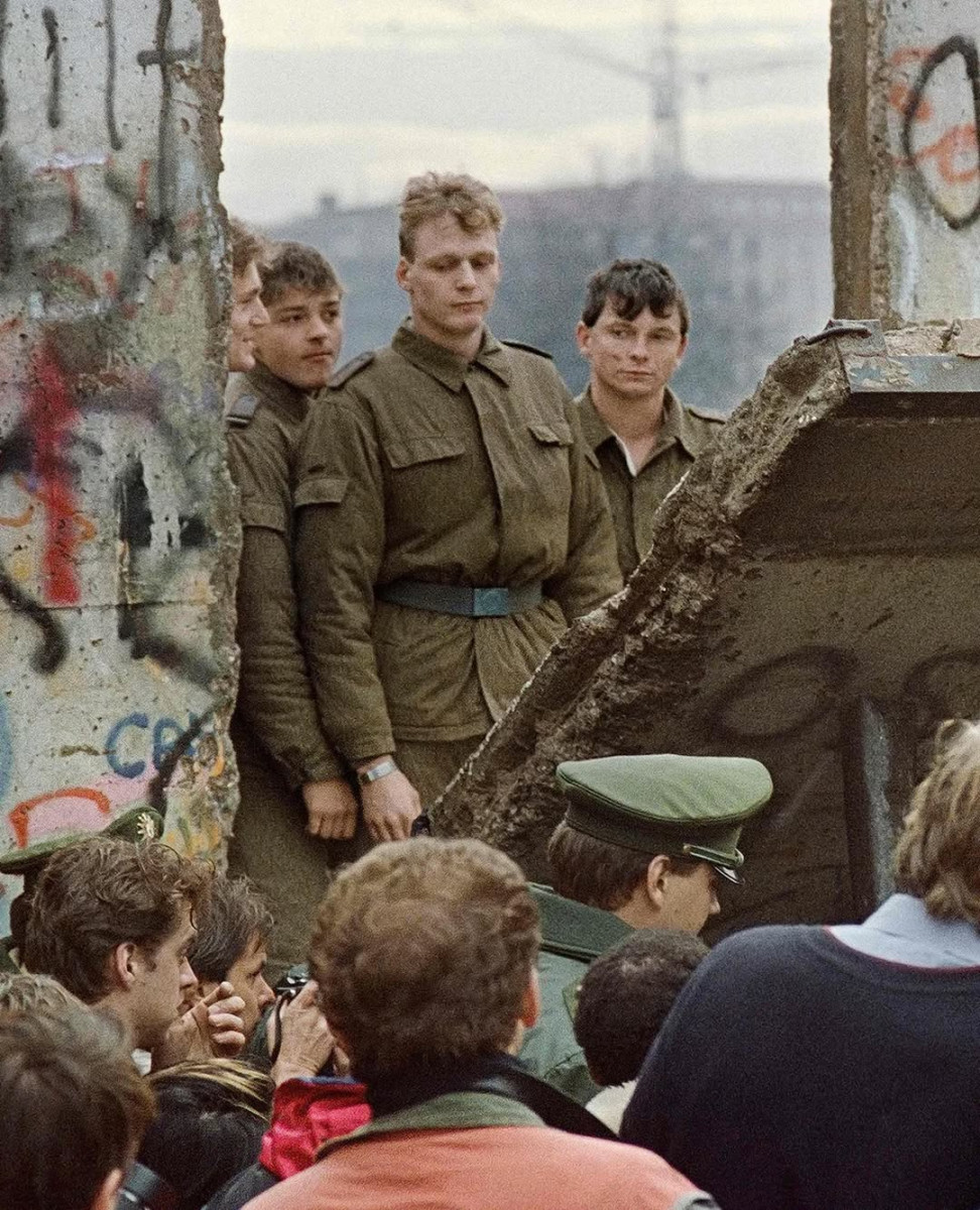 Пограничники ГДР смотрят в сторону Западного Берлина. 11 ноября 1989 года, спустя два дня после официального падения Берлинской стены, завершившего 28 лет разделения.
