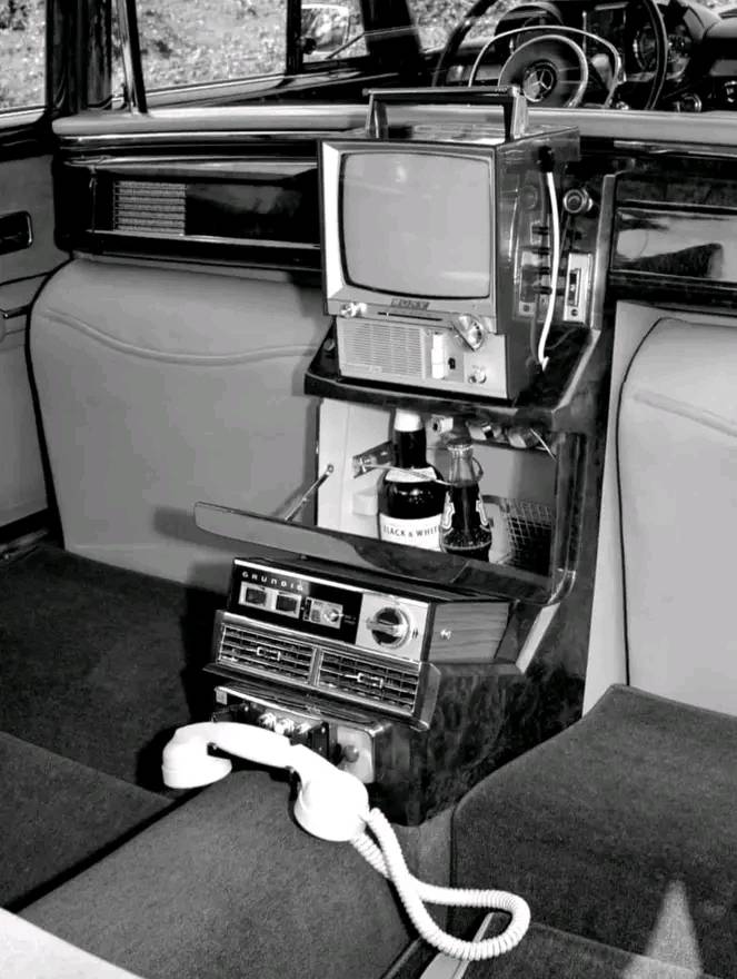 Премиальный блок Mercedes Fidelity 1965 года: телевизор, телефон, мини-холодильник и радио, всё в одном устройстве для автомобиля.